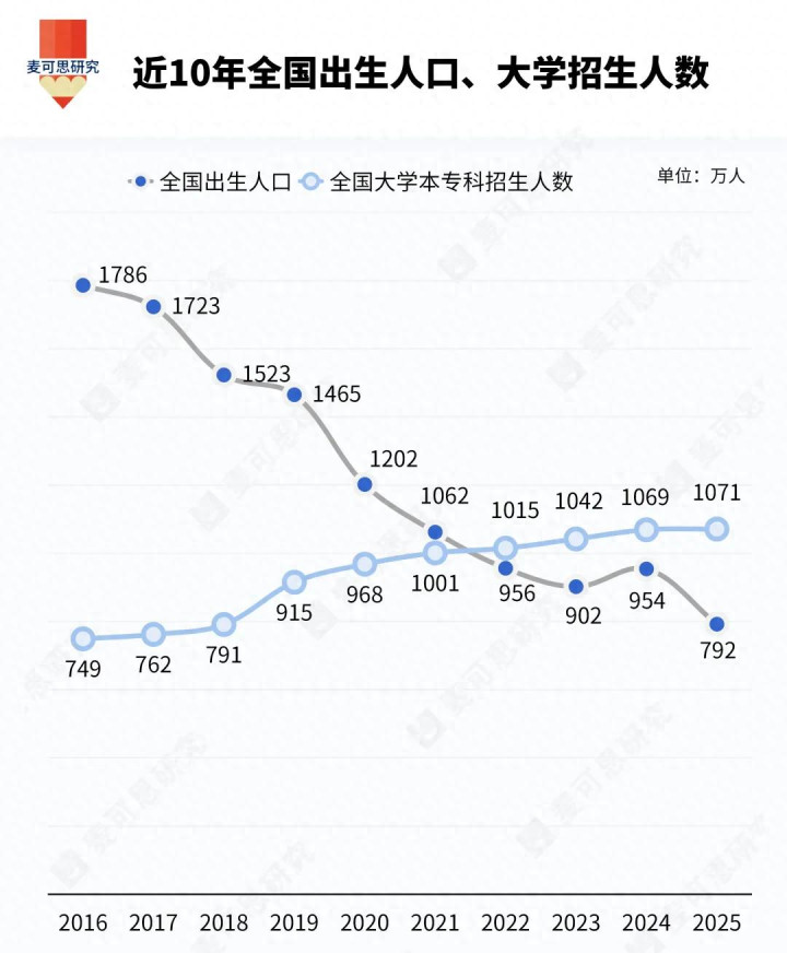 统计局数据夸耀,2022年起,天下泛泛本专业招生东说念主数初度跳跃过去天下新生诞生东说念主口数。而后招生限度与新生东说念主口抓续倒挂,宣告高级考验生源增量时期行将终结。