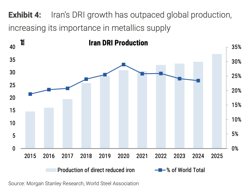 伊朗是世界主要的直禁受复铁(DRI)供应国,2025年分娩了约3700万吨直禁受复铁,占世界总产量的25%。
