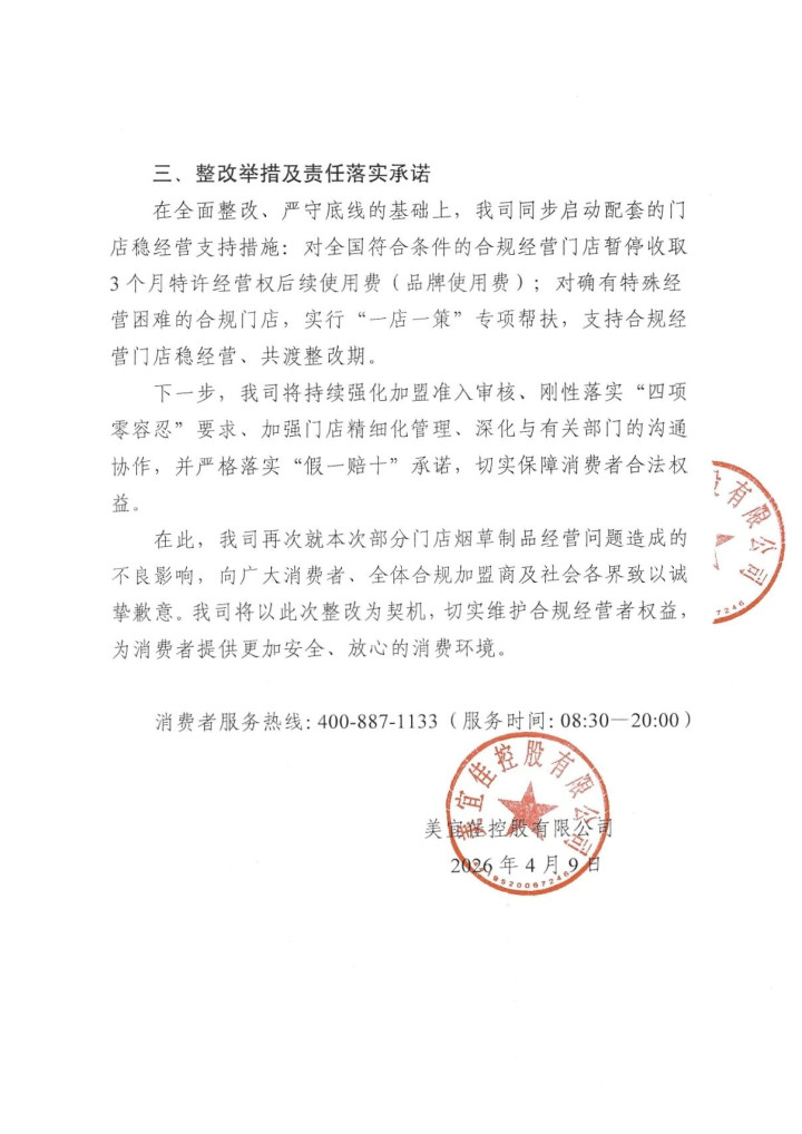 4月9日,好意思宜佳发布对于部分门店香烟成品考虑问题的阶段性措置施展通报。经全面自查,依据关连要求及加盟合规左券商定,对排查中发现有在要紧涉烟考虑尽头、且不妥当不绝和解条目的门店,公司已照章依约与关连加盟商打消和解关系,天博体育app认为606家。后续,对于经香烟专卖把握部门核实阐发并照章作出处理决定的门店,公司将第一技艺依规措置,毫不姑息。