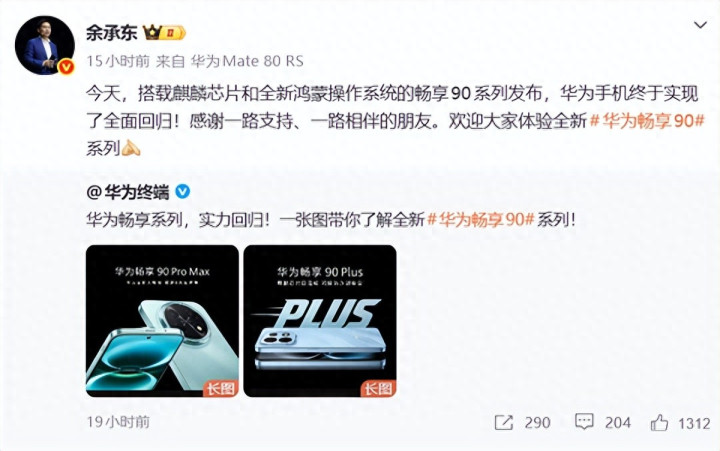 3月23日,余承东通过微博贼人胆虚地官宣:“搭载麒麟芯片和全新鸿蒙操作系统的畅享90系列发布,华为手机终于收尾了全面回首!感谢总共相沿、总共相伴的一又友。”