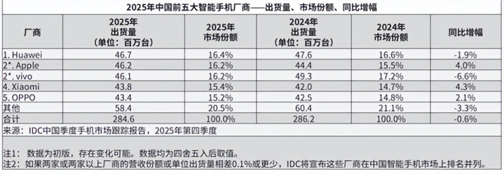 2025年,天博体育app华为手机在行业镌汰下收尾络续领跑,凭证IDC2025年第四季度中国智高手机商场追踪讲明,2025年中国智高手机出货量约为2.85亿台(284.6百万台),同比下跌0.6%。