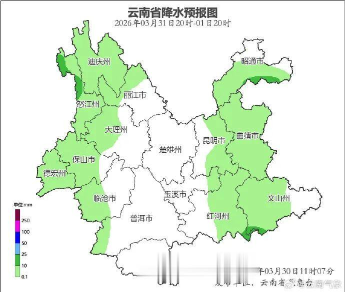 3月30日20时到3月31日20时:昭通市、曲靖市北部阴有小雨局部中雨,曲靖市南部、昆明市东部、文山州、红河州东部、迪庆州西部、怒江州、大理州西部、保山市、德宏州、临沧市西部多云有阵雨局部中雨,其他地区晴间多云。