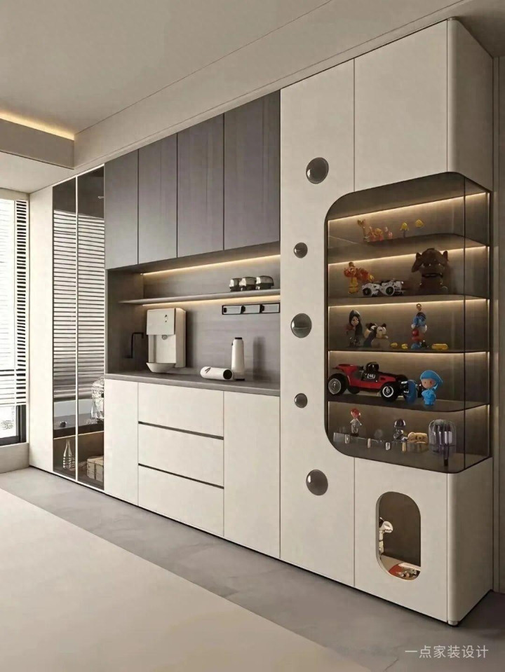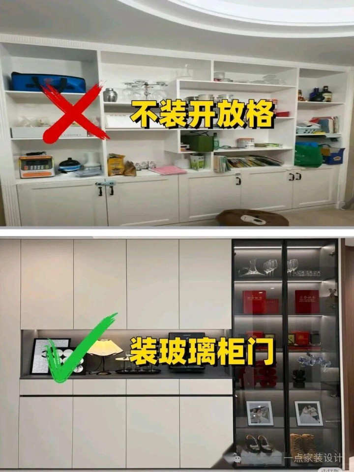 那种全打开的怒放格,摆啥王人显乱,三天不擦一层灰,擦到你怀疑东谈主生。不如作念几扇玻璃门的展示区,内部装个灯带,摆点好看的杯子酒具,既有好意思瞻念又无谓天天吃灰。