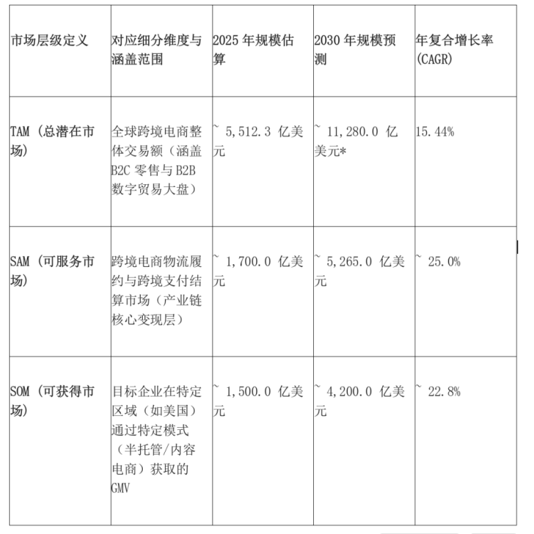 TAM(Total Addressable Market)的测算逻辑: TAM代表了在莫得任何物理和交易管制下,通盘跨境电商赛说念可能达到的最大表面营收天花板。测算基于“从上至下”(Top-Down)的宏不雅推演。中枢假定是公共互联网渗入率的刚性增长以及智高东说念主机在新兴经济体(亚太、拉好意思、非洲)的全面普及。阐明多项筹商交叉印证,公共零卖电商大盘销售额展望到2026年将激增至8万亿好意思元以上,而跨境销售的增长速率展望将是举座电商市集增速的两倍,展望至2030年,广义的跨国销售额(含传统数字贸易)将突破5.6万亿好意思元。在狭义的跨境电商零卖端,其限度将从2025年的5512.3亿好意思元稳步攀升,复合年增长率达15.44%。驱动TAM高速扩容的中枢身分包括:公共奢侈者对高质料、各异化及廉价异邦商品的苍劲需求,以及以“超等应用”(Super-app)为载体的挪动支付体系在公共范围内的无缝买通。