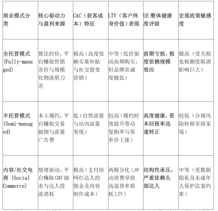 表2:跨境电商三大主流交易模式的单元经济模子(UE)中枢筹办对比