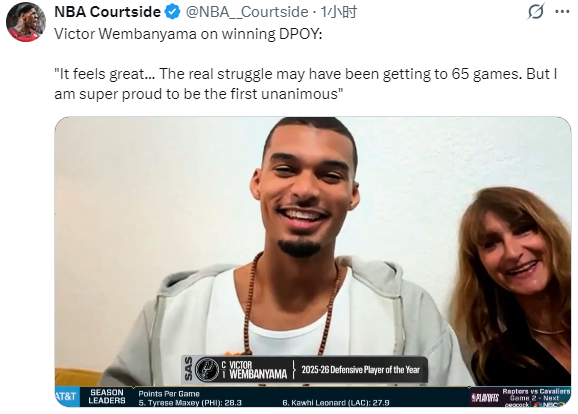 文班亚马还说谈:造就说,我以为咱们平庸忽略团队的要素,因为我坐在这里,刚巧成为了聚光灯下的阿谁东谈主,但我是这个体系的一部分,如若莫得我的队友们,他们完成了那些轮转疑望,让我大略处于聚光灯下,我不可能赢得这个奖项,也不可能作念到我所作念的。”
