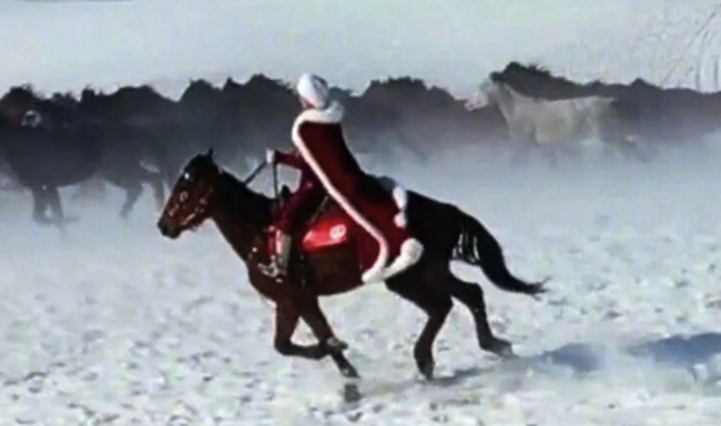 为保举昭苏冰雪旅游资源,贺娇龙从影相馆借来一件红色大氅,在雪原上骑马拍摄了一段不到一分钟的视频。