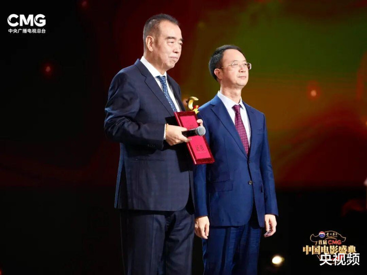 △中央播送电视总台党构成员、副台长余俊生为陈凯歌颁发“艺术长青特别孝顺”荣誉