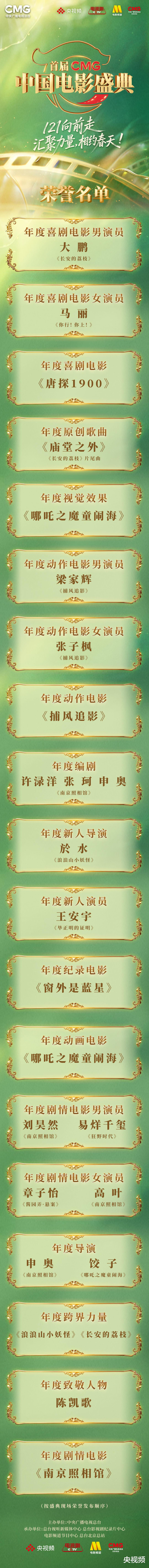 《唐探1900》荣获“年度笑剧电影”,《捕风追影》荣获“年度动作电影”,《南京摄影馆》主演刘昊然、《狂野期间》主演易烊千玺荣获“年度剧情电影男演员”,《酱园弄·悬案》主演章子怡、《南京摄影馆》主演高叶荣获“年度剧情电影女演员”。首届《CMG中国电影盛典》安身电影类型化发展,既是对电影东谈主匠心创作的充分细则,对电影艺术的温煦敬意,亦然对当下中国电影类型化探索的积极呈报。